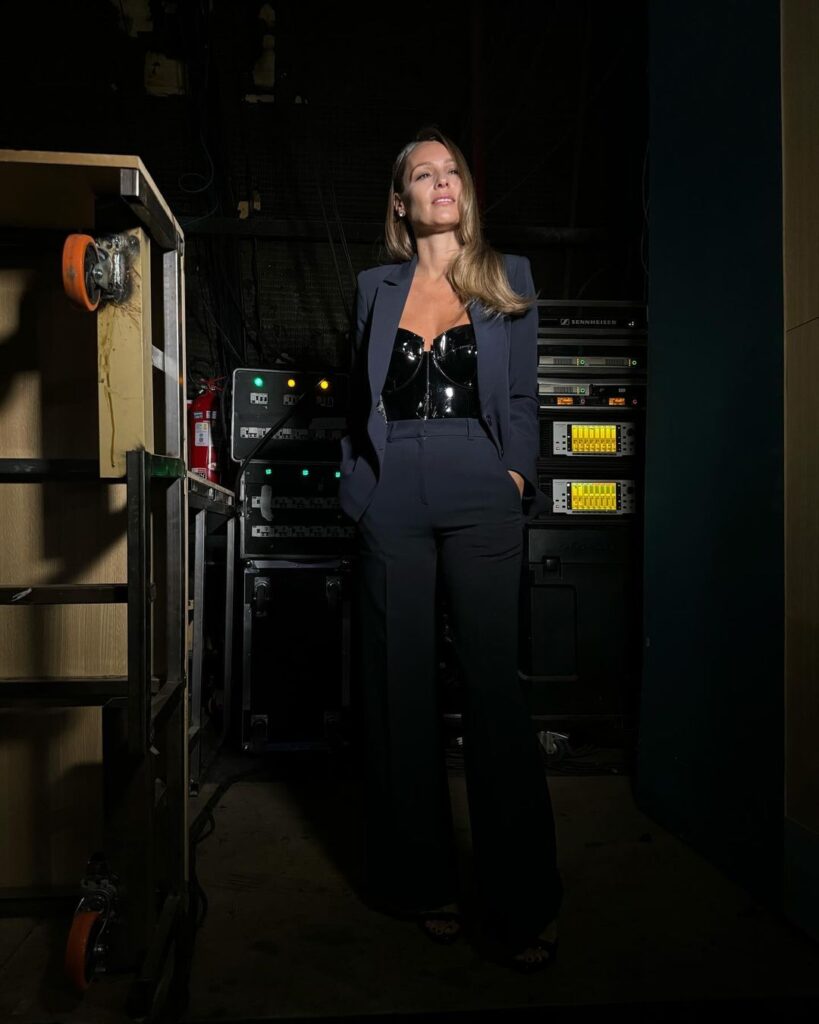 Pampita eligió un conjunto de blazer y pantalón entallados, a los que sumó un corset vinílico, que resultó en un sensual look de noche.