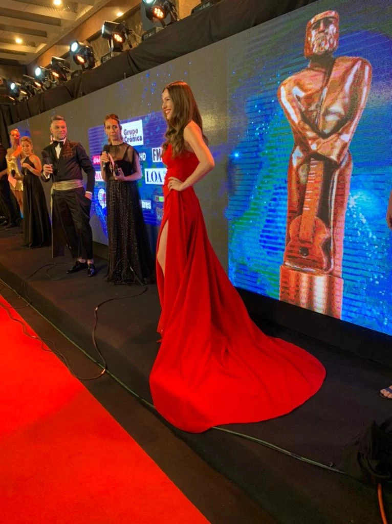 “Estoy con muchas ganas de llevarme la estatuilla esta noche también”, dio respecto a la nominación que tiene por “Pampita Online” que en la temporada de 2019 se emitió en KZO. La modelo estuvo acompañada por Roberto García Morirán, Bautista Vicuña y Ana Morirán.