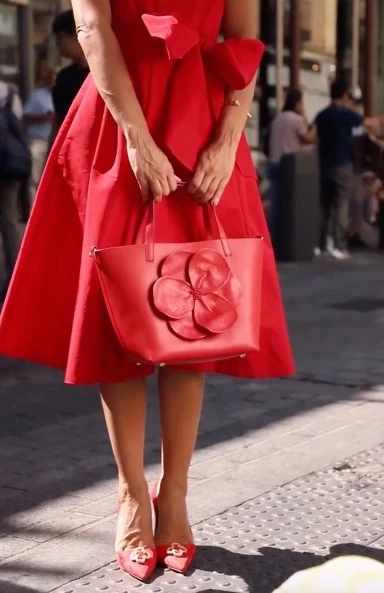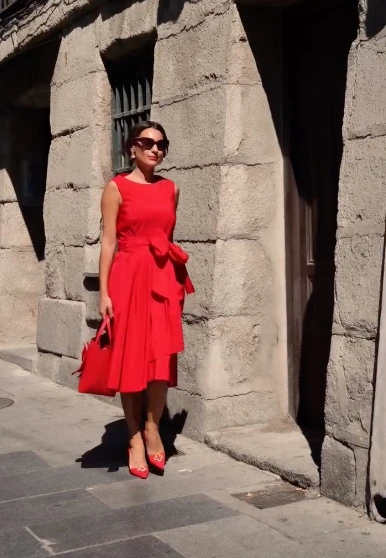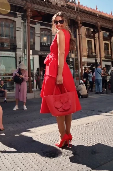 El vestido elegido tiene una silueta midi con vuelo, acompañado por un lazo en la cintura que realza la figura y aporta un aire romántico. El corte sin mangas deja los brazos al descubierto y refuerza la frescura de un look ideal para un evento de día o de tarde. El color rojo intenso es el gran protagonista, transmitiendo energía, seguridad y sofisticación, sello indiscutible de la firma.