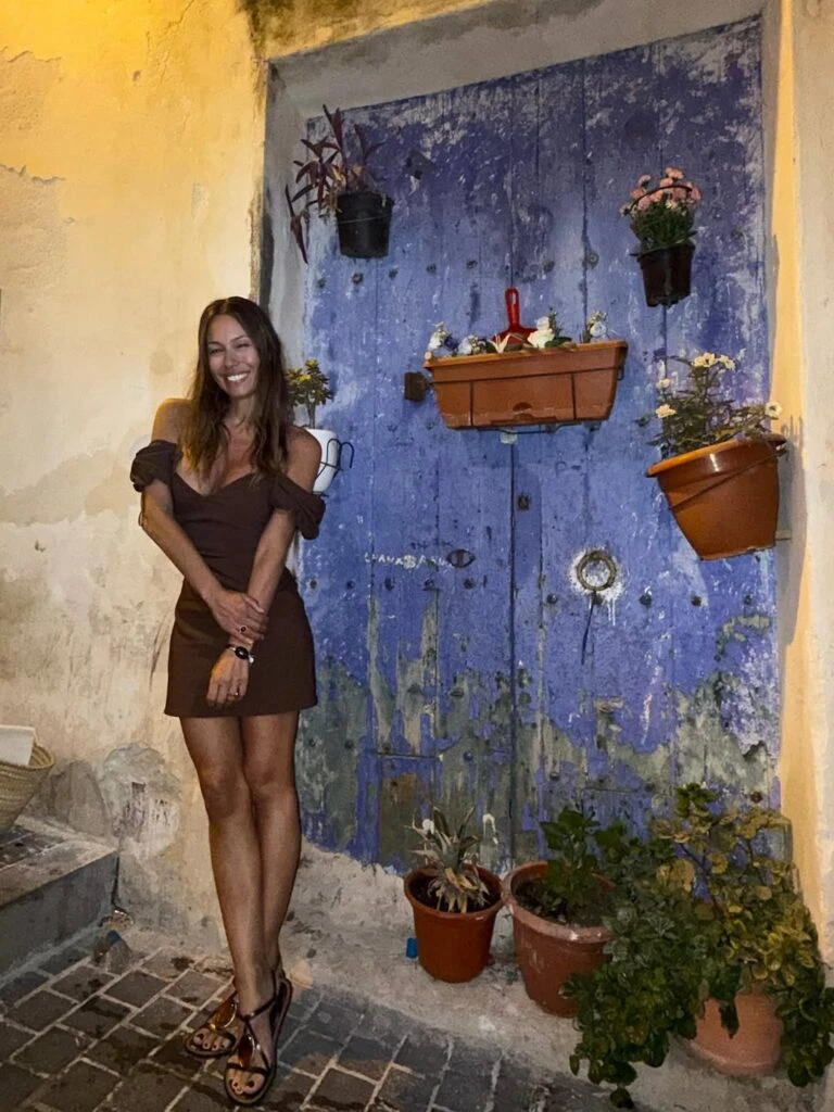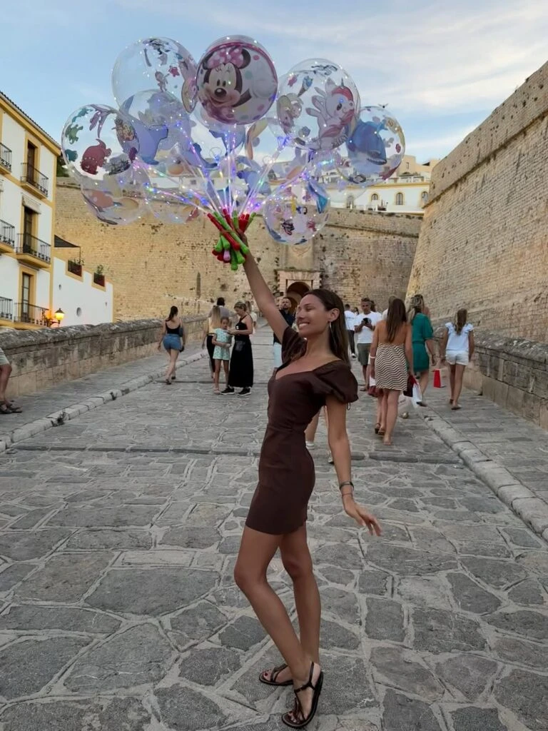 En otro de sus paseos por la isla, Pampita apostó por un mini vestido marrón chocolate con mangas cortas abullonadas, escote adaptable tipo off the shoulder y espalda descubierta con tiras cruzadas. Un diseño que mezcla sensualidad y comodidad, ideal para las tardes de calor mediterráneo.