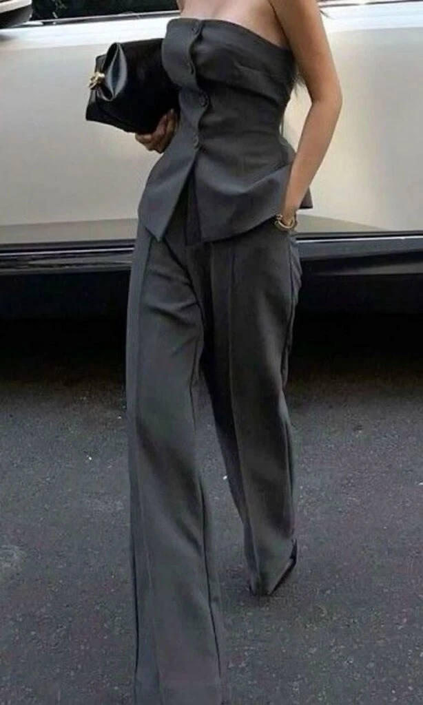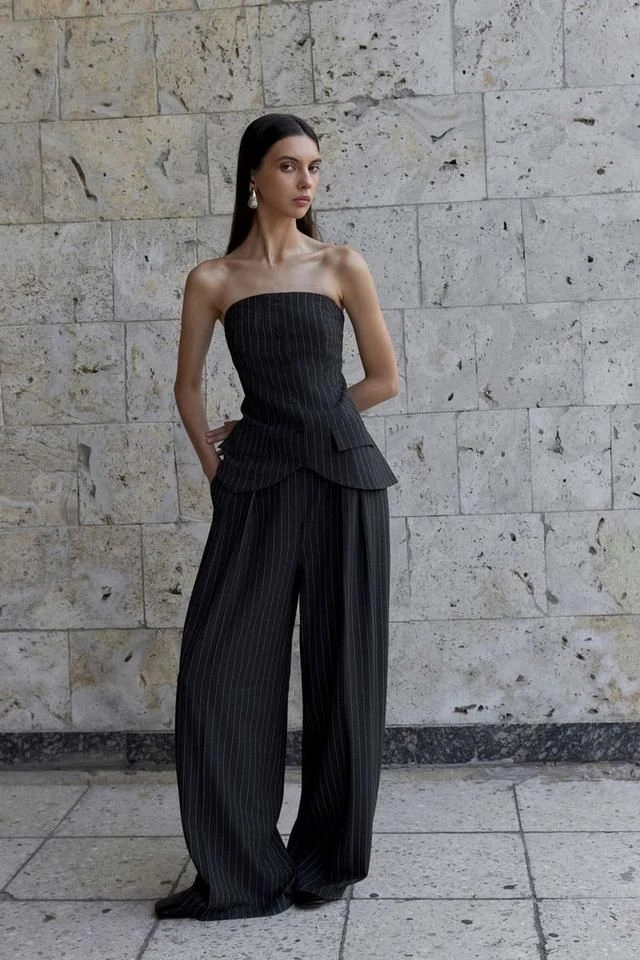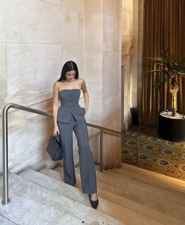 El look de la modelo, consistió en un conjunto de tela sastrera compuesto por un top strapless estructurado, tipo corsetería, que marcó la silueta y además, aportó un aire sexy al outfit. Por su parte, el pantalón de vestir de corte recto levemente acampanado y tiro alto equilibró el conjunto, logrando una estética elegante y minimalista.