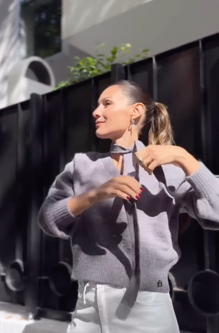 La modelo mostró un look en gris y blanco, compuesto por un suéter con lazo en el cuello que combinó con jeans y sandalias plateadas. Una composición de vestuario súper trendy para una salida en estos días.