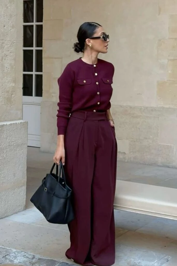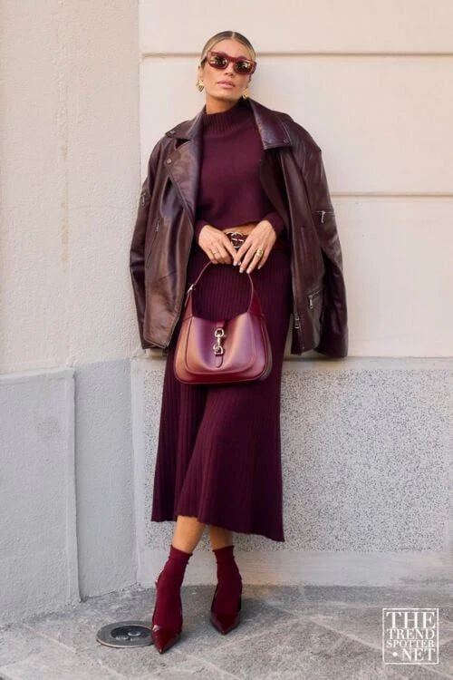 El color cherry se posiciona como uno de los favoritos de la temporada. Más profundo que el rojo clásico y con tintes de vino o borgoña, este tono aporta calidez, personalidad y un aire sofisticado a cualquier outfit. Se lleva tanto en total looks como en piezas clave, desde abrigos hasta accesorios.