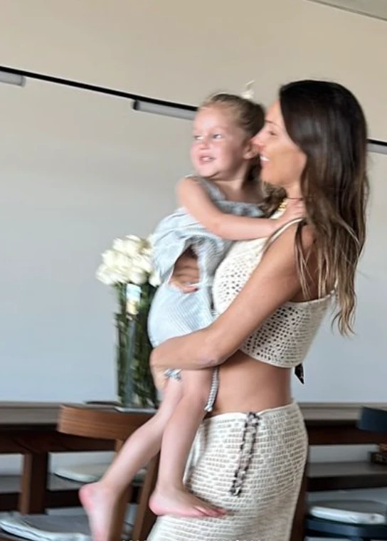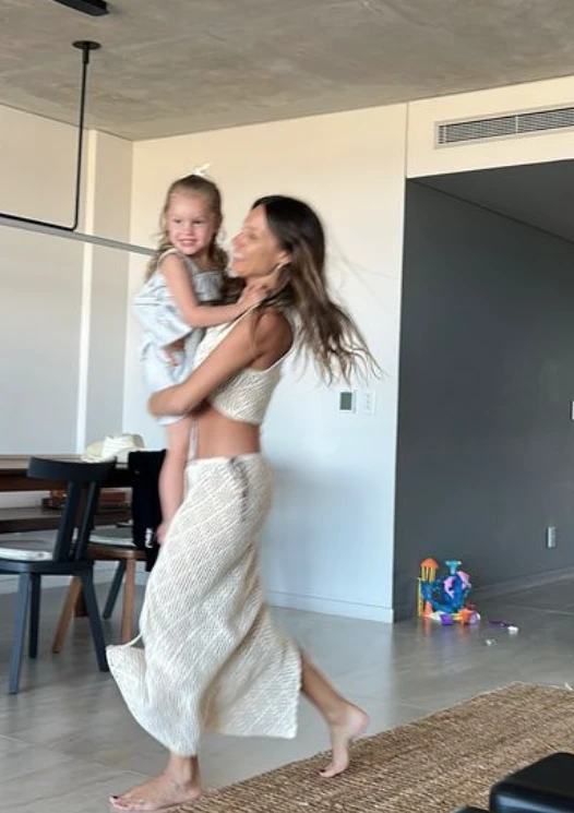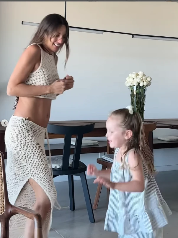 Carolina Ardohain también aprovechó para tomarse fotos a la orilla del mar, posando con un traje de baño de dos piezas. Más tarde, cargó agua en un baldecito para jugar con su pequeña de tres años.