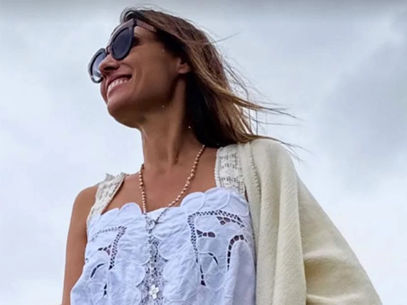 El día nublado no fue excusa para ponerse un minivestido boho chic, sin mangas, con bordados calados y puntillas. Sobre los hombros llevó un chal color manteca y completó el look con botas de montar de gamuza en color habano.