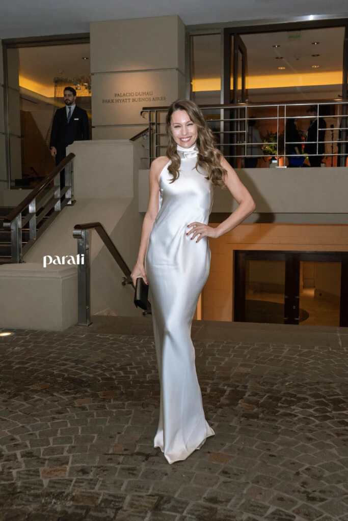 Fiel a su estilo impecable, Pampita deslumbró con un vestido largo blanco, confeccionado en un tejido fluido con escote al cuello tipo halter que dejaba ver su espalda con elegancia.
