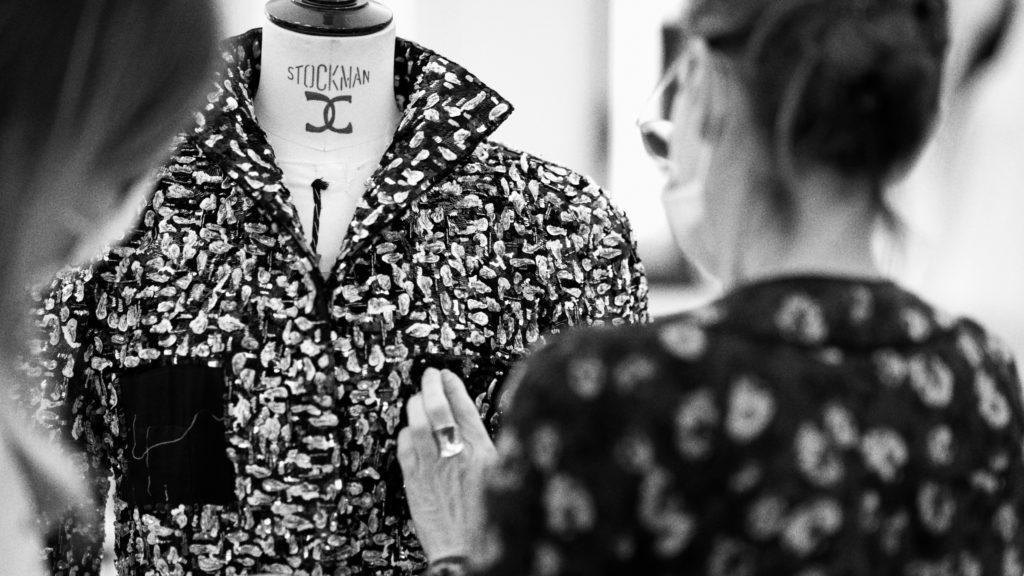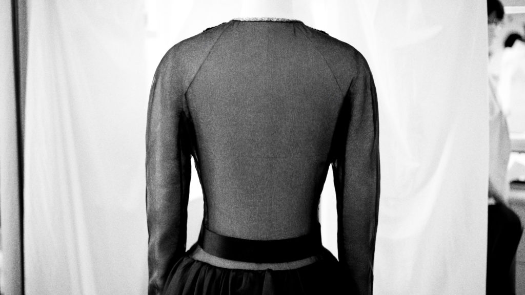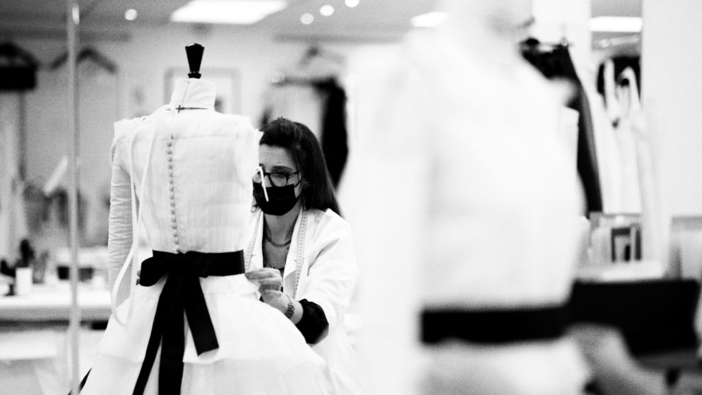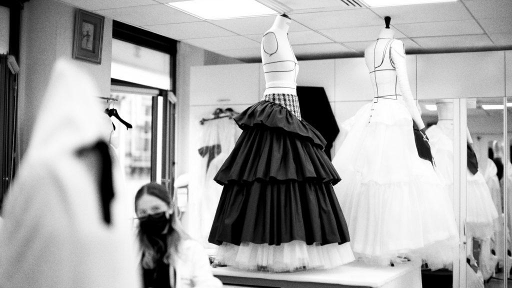 "Fue cuando redescubrí estos retratos de Gabrielle Chanel con vestidos al estilo de la década de 1880 en blanco o negro, que inmediatamente pensé en cuadros", explica Virginie. Entonces se inspiró en "obras de Berthe Morisot, Marie Laurencin y Édouard Manet. Hay vestidos de inspiración impresionista, faldas que parecen cuadros y un vestido largo de raso blanco salpicado de lazos negros como el de Morisot … "
