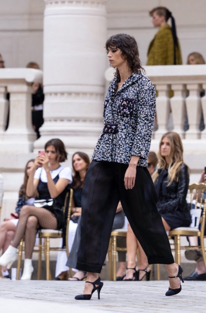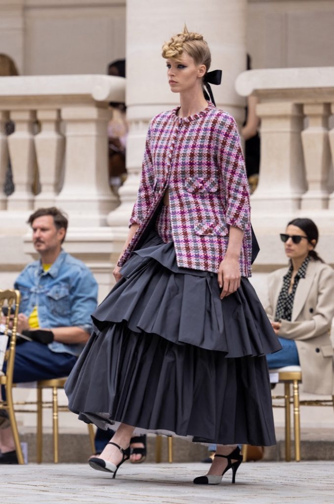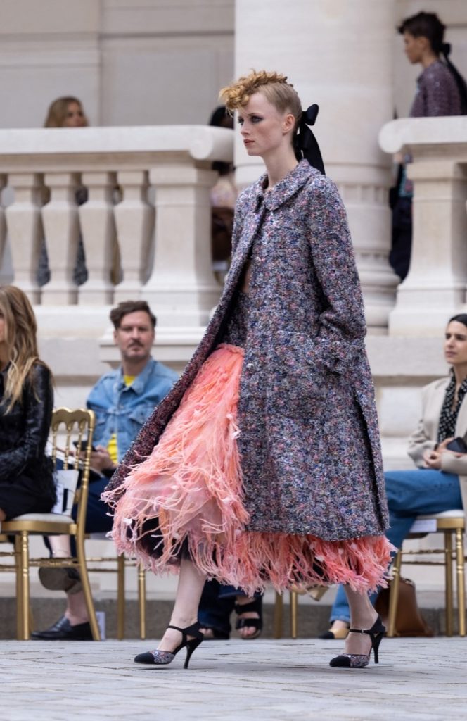 "Hay vestidos bordados con nenúfares, una chaqueta de tweed negro hecha a mano con plumas con flores rojas y rosas”, dice Virginie Viard. “También estaba pensando en los jardines ingleses. Me gusta mezclar un toque de Inglaterra con un estilo muy francés. Es como mezclar lo masculino y lo femenino, que es lo que también he hecho con esta colección. Ese giro es una parte muy importante de lo que soy", señaló Viard.