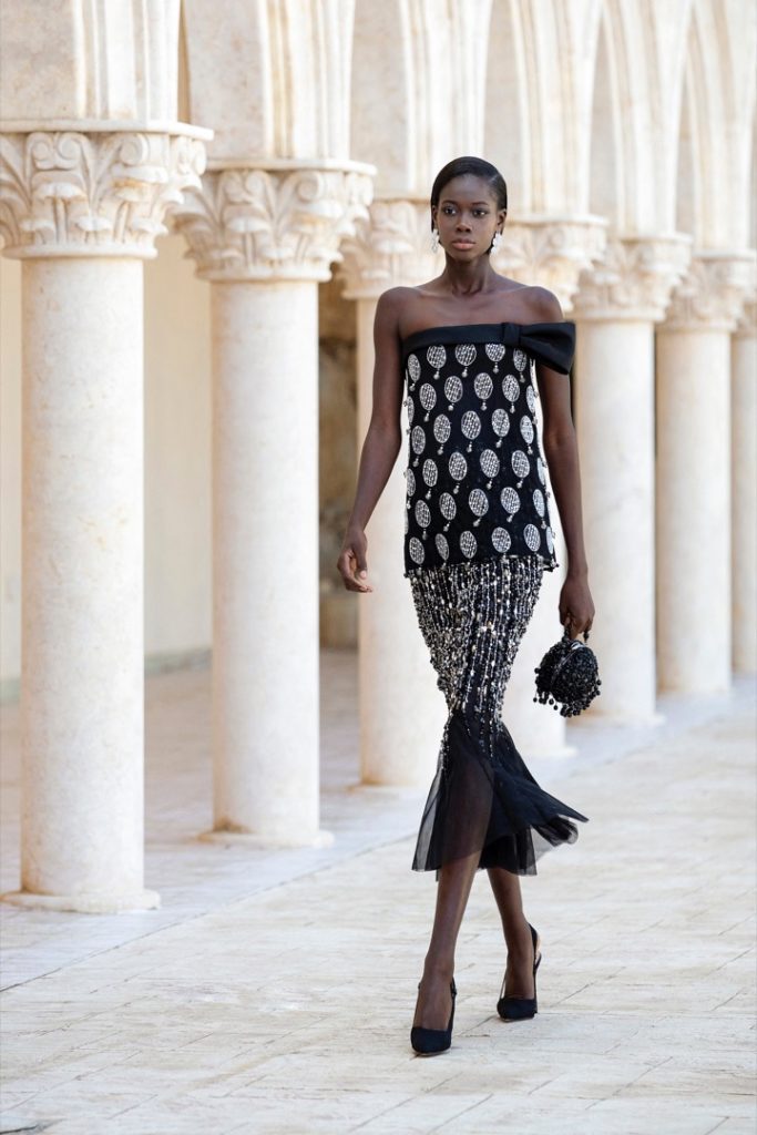Muchos de los diseños se inspiraron en el movimiento Mod, una serie de siluetas evanescentes. Además combina plumas y cristales brillantes, pero también en atuendos envueltos en misterio y sobriedad que llevan una mirada fresca y nueva a su línea couture.