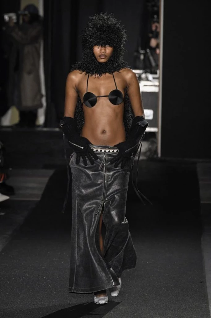 Bolsas de plástico a modo de vestidos, arneses de piel y argollas metálicas sobre un top básico y lencería superpuesta a faldas y pantalones, fueron algunas de las arriesgadas prendas que se vieron en la línea, cargada de referencias al sadomasoquismo.