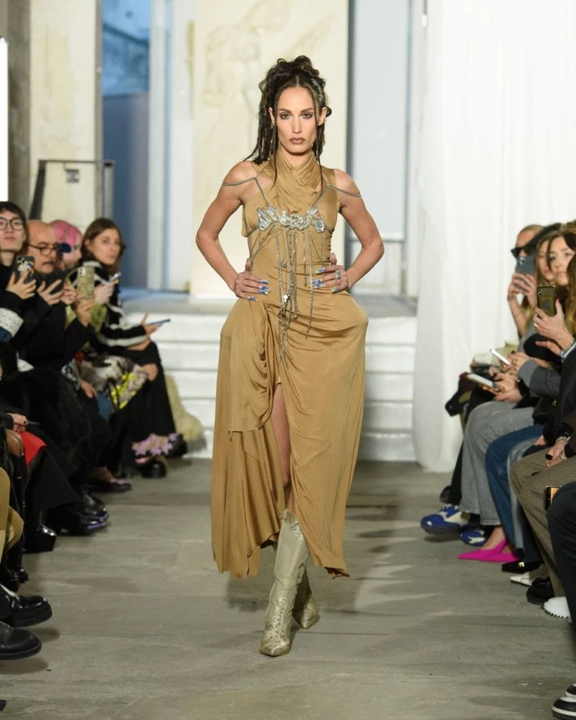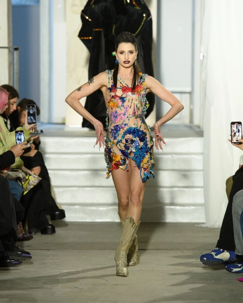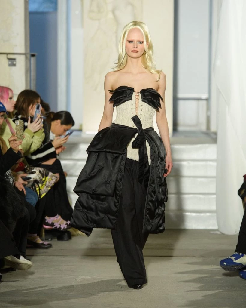 Weinsanto, que dio sus primeros pasos junto a Jean-Paul Gaultier y el año pasado consiguió atraer muchísimas nuevas miradas gracias a la aparición de uno de sus vestidos en la serie “Emily in Paris”, recuperó los códigos de los años 90 transformando edredones en chaquetas, vestidos y colas de traje.