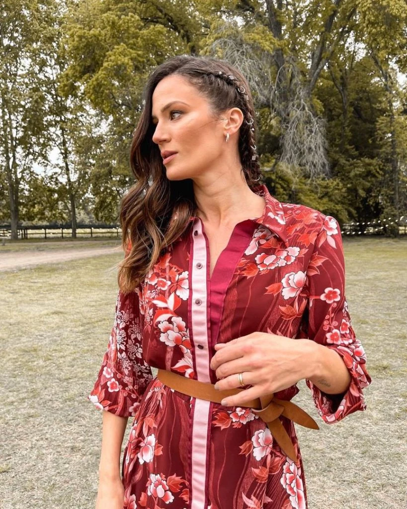 Para la gran final, la conductora eligió un vestido camisero bien largo con estampa de flores en colores rojo, naranja y blanco. Complementó con botas bucaneras en color suela y un cinturón para marcar su cintura también al tono.