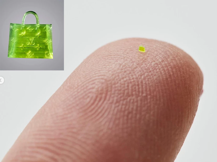Para su elaboración se utilizó resina con un proceso llamado polimerización de dos fotones, una especie de impresión 3D para objetos microscópicos. La silueta rectangular del bolso OnTheGo de Vuitton y su logo bien marcado lo convirtieron en candidato perfecto para realizar esta miniescultura logrando que pudiera reconocerse el diseño original.