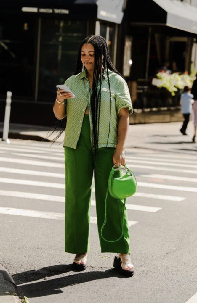Al verde lo empezamos a ver tímidamente y ahora, llega en todas sus tonalidades. Por eso, es ideal combinarlo entre sí. ¿el resultado? un atuendo canchero como el que vemos en la imagen, ideal para usar todo el día.