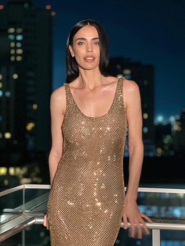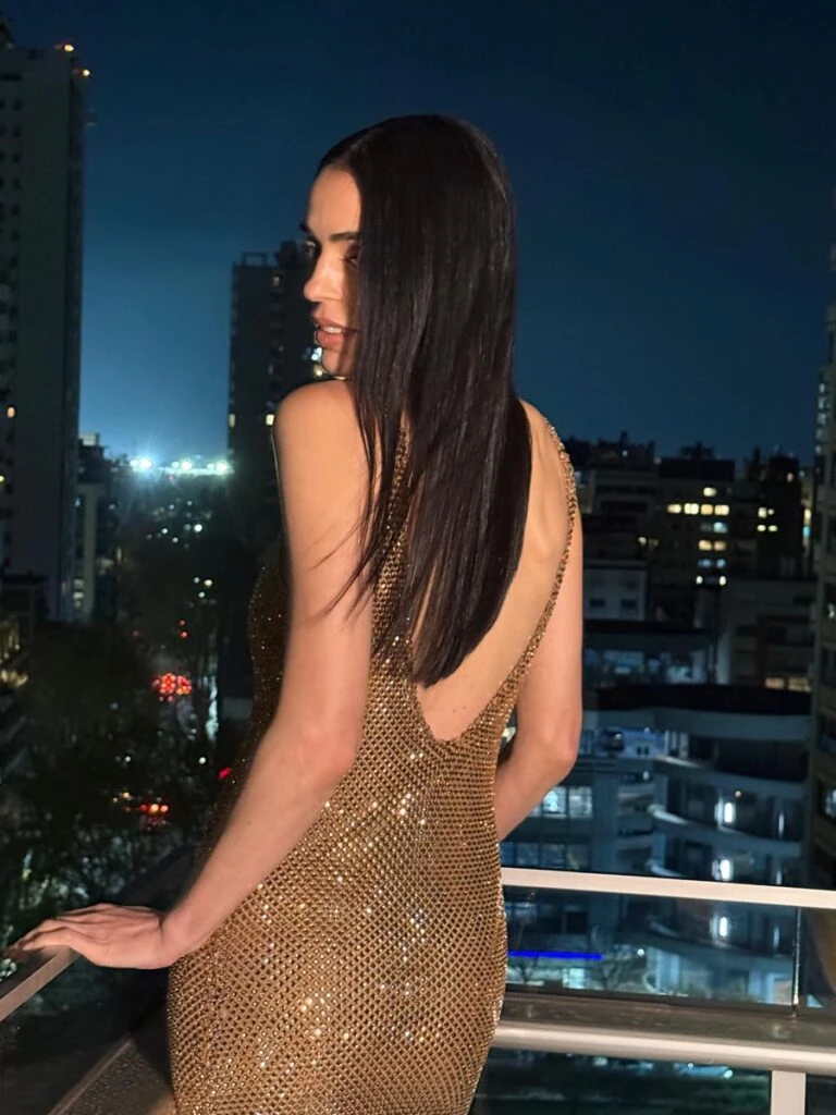 Priscila Crivocapich sorprendió en la noche porteña con un estilismo que combinó sofisticación y sensualidad en partes iguales. La modelo lució un vestido largo de silueta recta firmado por Joti Arriague, confeccionado en un tejido dorado bordado con micro lentejuelas que capturaban cada destello de luz.