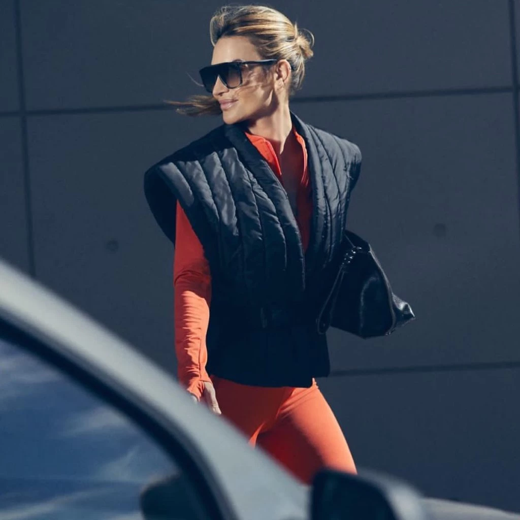 La prenda principal de sus outfits fue un chaleco puffer con importantes hombros que se cierra con un cinturón para marcar la cintura.