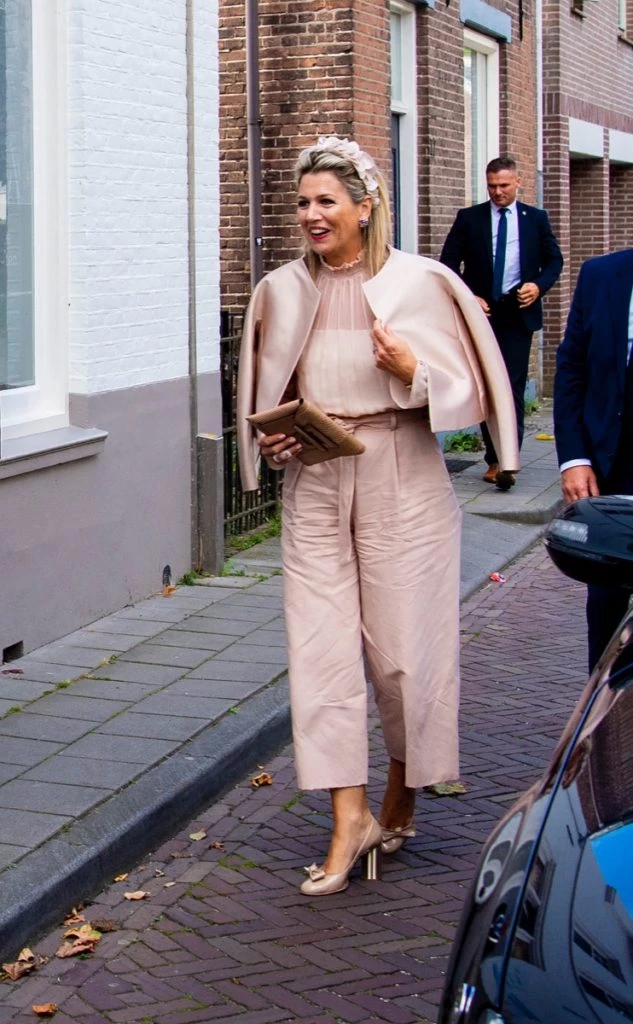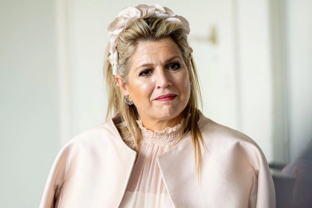 Para coronar su look, la reina de los Países Bajos, llevó una diadema de flores de tela XL en el mismo color de su conjunto, una creación de la sombrerera belga Fabienne Delvigne. Un detalle súper chic que Máxima suele usar en sus outfits.