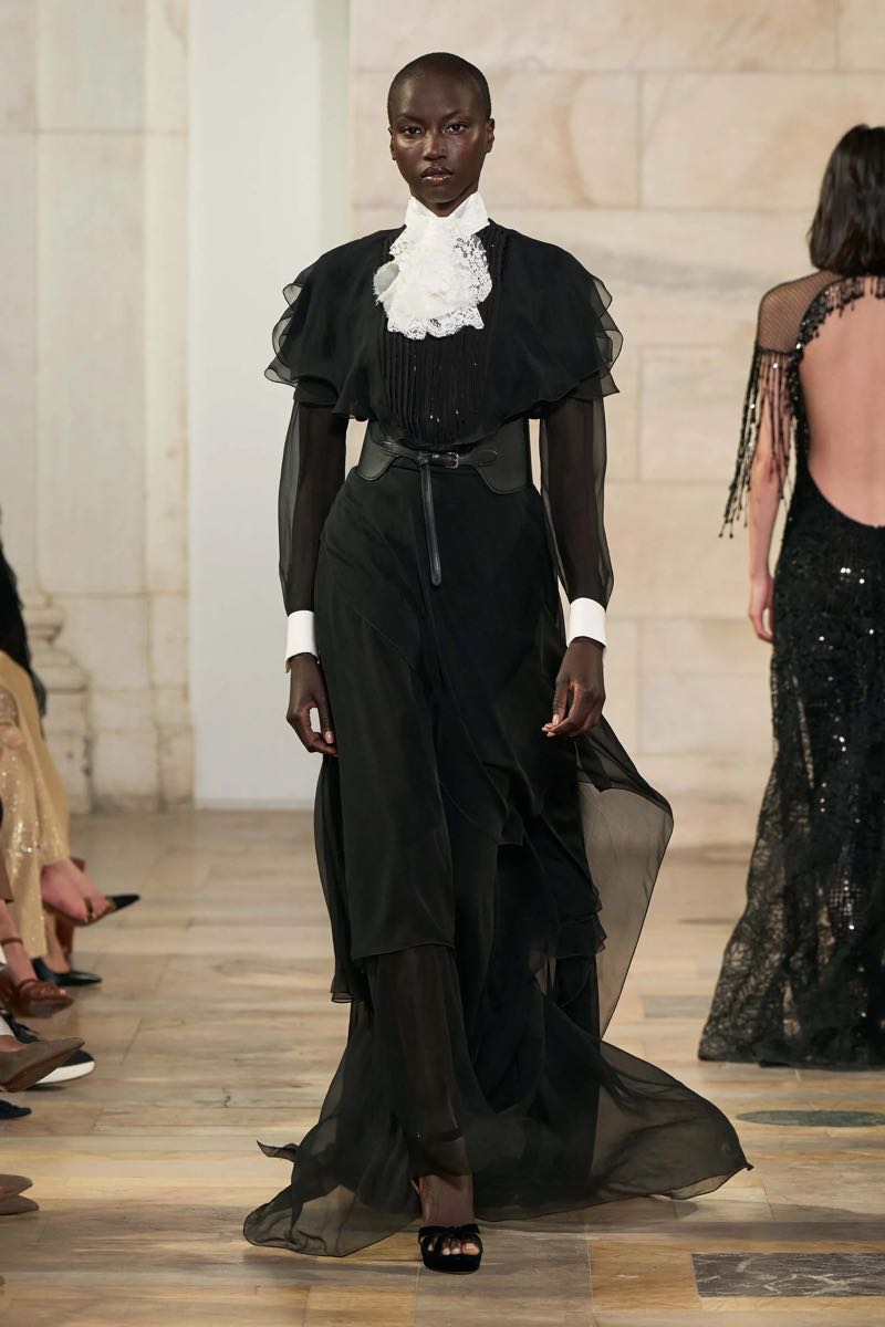 El desfile reversionó este arquetipo masculino con abrigos cruzados, pantalones ajustados, bustiers de cuero y vestidos camiseros con vuelo etéreo.