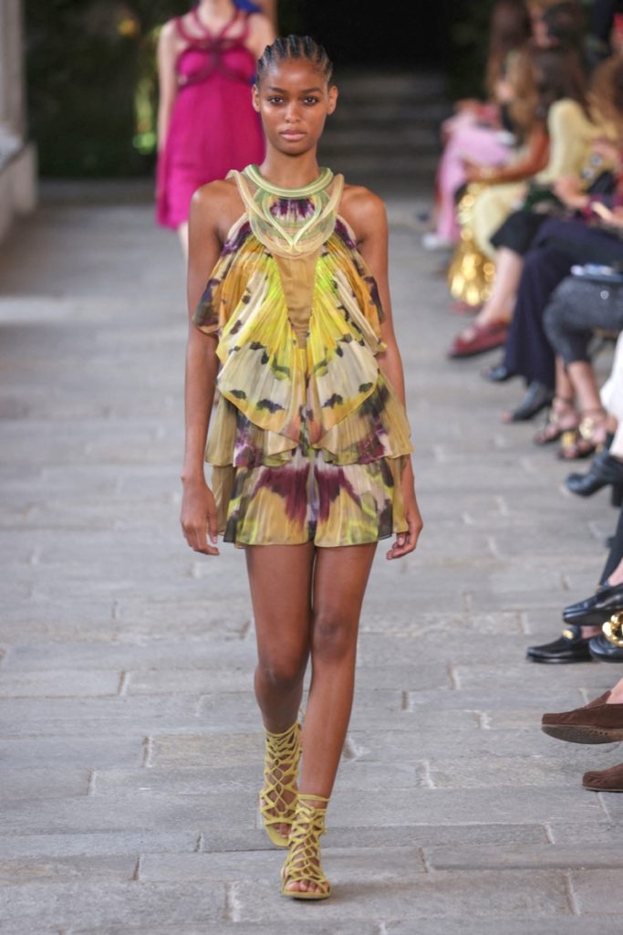 Los estampados de mariposas simbolizaron el renacimiento y metamorfósis de la etiqueta y las evocativas curvas acompañan vestidos de ligeros que se adornaron con flecos otorgando movimiento y libertad.