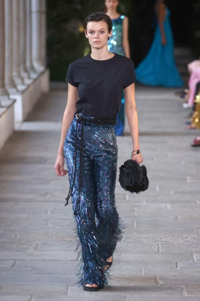 Las lentejuelas también estuvieron presentes para las propuestas nocturnas y se bordaron en vestidos, pantalones y polleras.