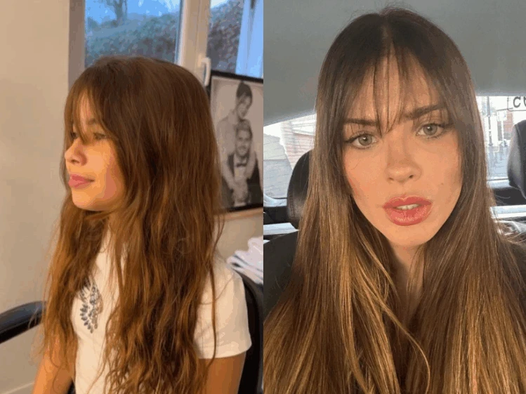 La pequeña de 12 años demostró interés por las tendencias beauty y se animó a un curtain bangs, uno de los flequillos más buscados del momento. Se trata de un corte largo, con caída suave a ambos lados del rostro, que enmarca la mirada y aporta movimiento natural.