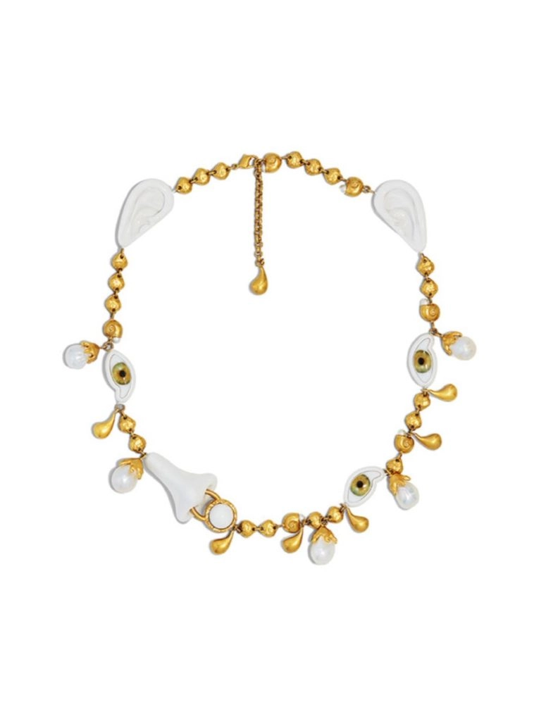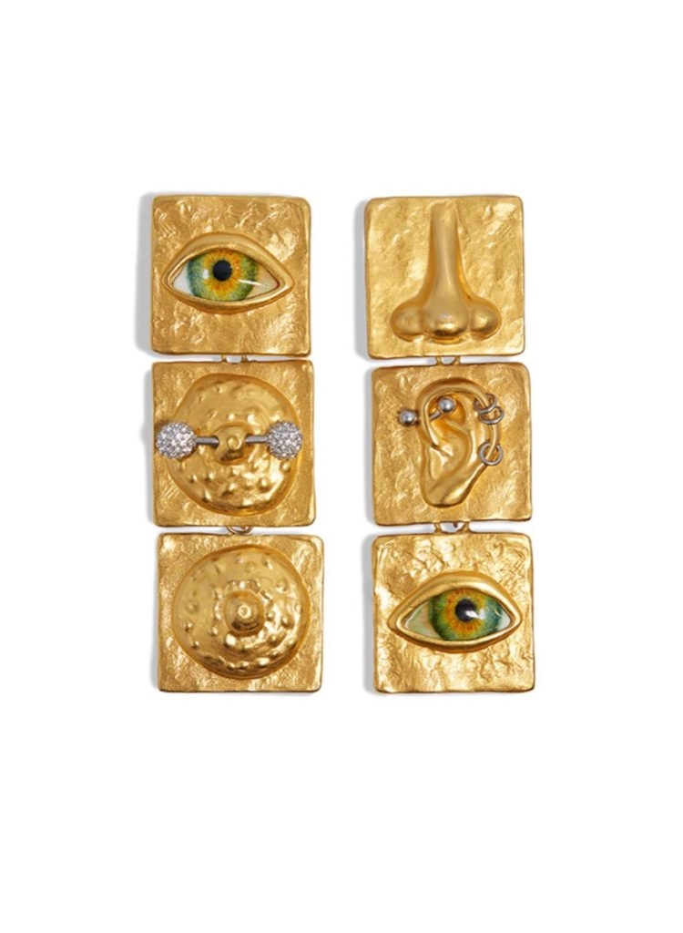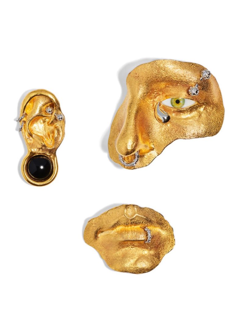 El diseñador presentó una líneas de joyas surrealista que presentan siluetas esculpidas en forma de partes del cuarpo: orejas, labios, dedos, ojos, nariz y boca.