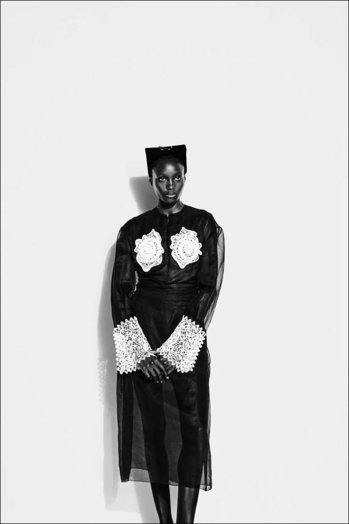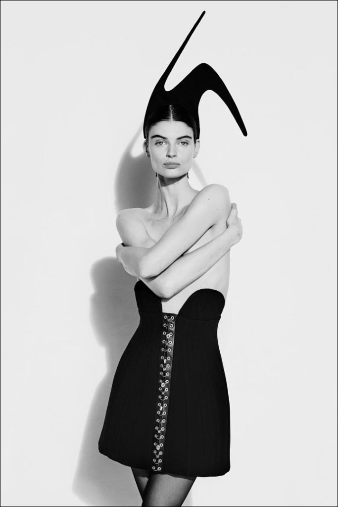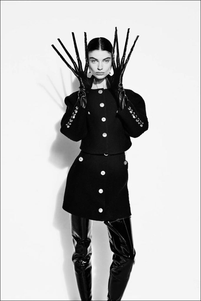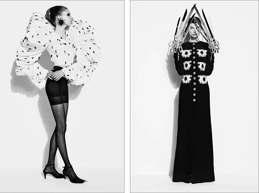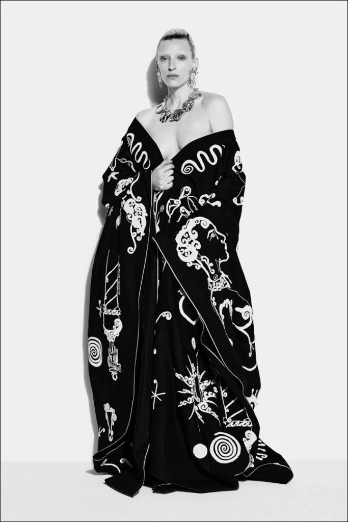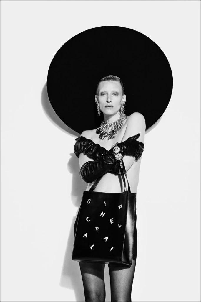 Esta temporada, las novedades de Schiaparelli son en color blanco y negro. Inspirándose en su más reciente colección de Alta Costura para la casa, Danile Roseberry, su director creativo, filtró la colección con trajes de raya diplomática, cuyos puños están rematados con cinco botones dorados en forma de ojo; caftanes gigantes con dibujos de flores y fauna alucinantes o abrigos vestidos de terciopelo.