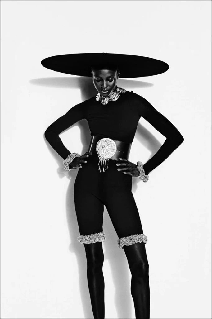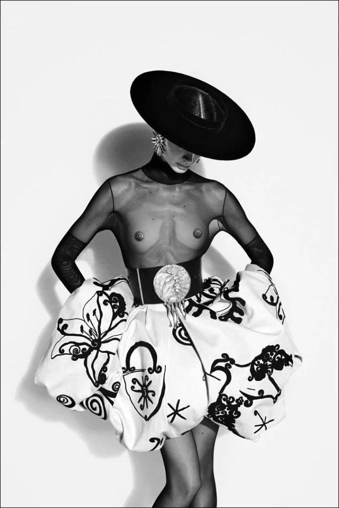 Uno de los looks que causó alto impacto fue una pollera blanca balloom con dibujos surrealistas que se combinaba con una polera de tul y gran cinturón con hebilla circular dorada.