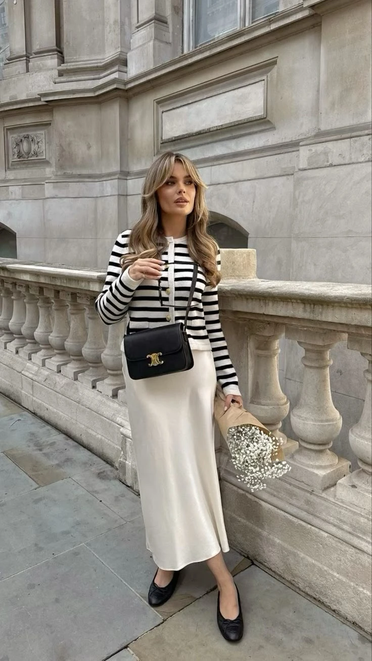 - Con faldas midi: Las faldas midi son ideales para combinar con este tipo de zapatos. Si quiero un look que mezcle elegancia y frescura, las faldas midi de línea A o plisadas con ballerinas son una apuesta segura. Aportan una silueta muy femenina y un aire retro que siempre resulta favorecedor.