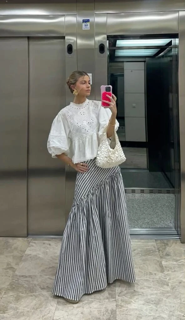 La esencia del estilo romántico está en la silueta. Vestidos con cintura marcada, faldas con vuelo y blusas de inspiración vintage se combinan para crear un aire aniñado, pero sin perder sofisticación. El secreto está en equilibrar las prendas románticas con accesorios contemporáneos, como sandalias minimalistas o carteras estructuradas.
