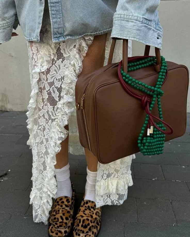 - Carteras estructuradas o tipo pouch: el contraste de materiales suma interés visual.