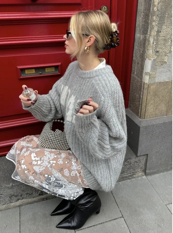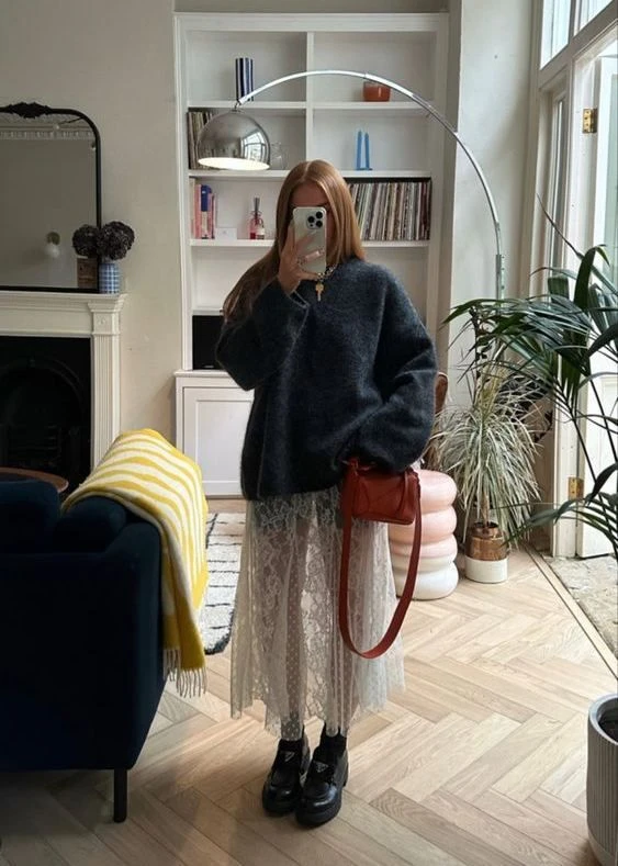 Los suéteres grandes, de lana o punto grueso, son el mejor aliado de la falda de encaje. Jugá con el equilibrio: si la parte inferior es liviana y romántica, sumá volumen arriba para generar contraste.