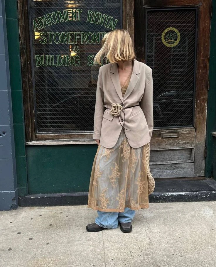 Si querés armar un look de impacto con una pollera de encaje en invierno, no tengas miedo de mezclar texturas, sumar volumen y jugar con los contrastes. Elegí una falda con diseño floral o texturas 3D y combinala con prendas oversize, básicos de sastrería o jeans. El resultado es un outfit moderno, chic y con mucha personalidad.