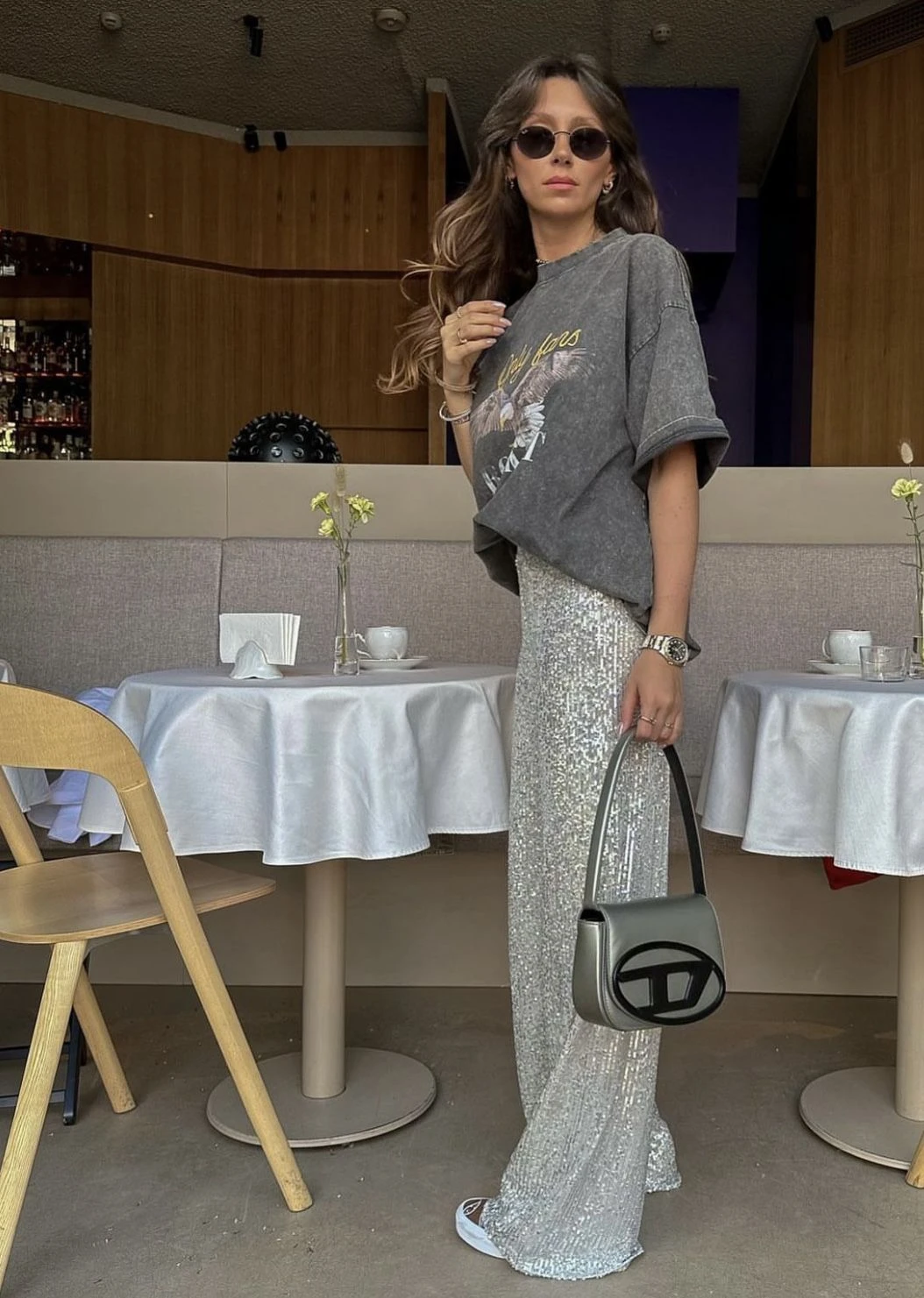 La regla de oro para lucir lentejuelas en horario diurno es simple: equilibrar el brillo con prendas más relajadas y texturas mates. Esto permite que el destello no opaque el conjunto y que el outfit conserve un aire fresco y urbano.