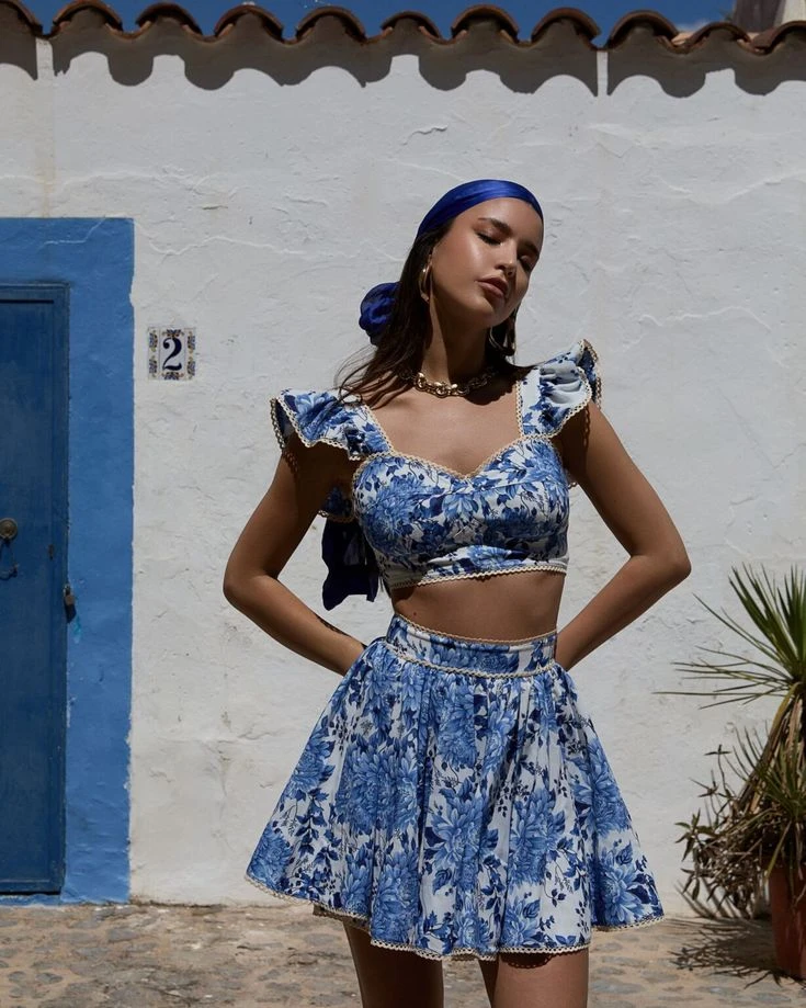 Los conjuntos estampados volvieron con fuerza, y este print mediterráneo hace que funcionen a la perfección. Los tops con volados, los crop rectos, los bandeau de lino… todos juegan con esa energía veraniega que necesitamos para salir del negro (que tanto amamos, pero que en enero nos derrite).
