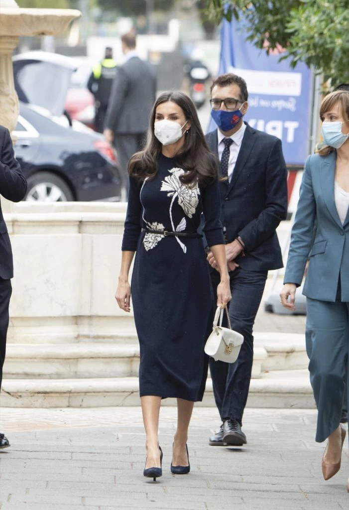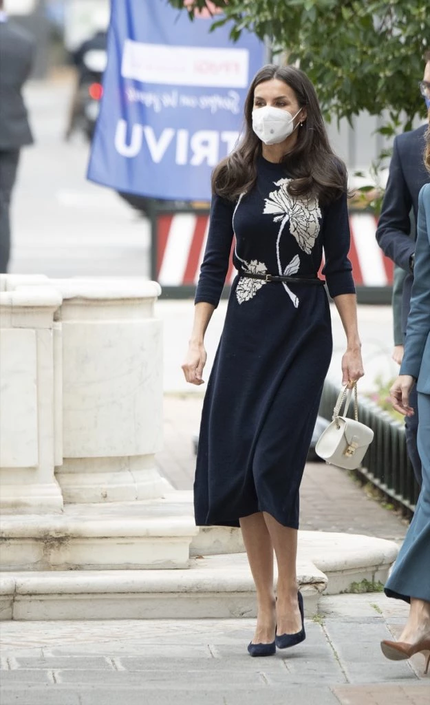 Para la ocasión, la monarca volvió a sorprender con un vestido tejido en color azul marino que pertenece a la firma Galcon Studio. Un elegante diseño de largo midi y manga al codo, con una llamativa estampa de dos claveles blancos. Fiel a su estilo, no dudó en remarcar su cintura gracias a un mini cinturón negro.