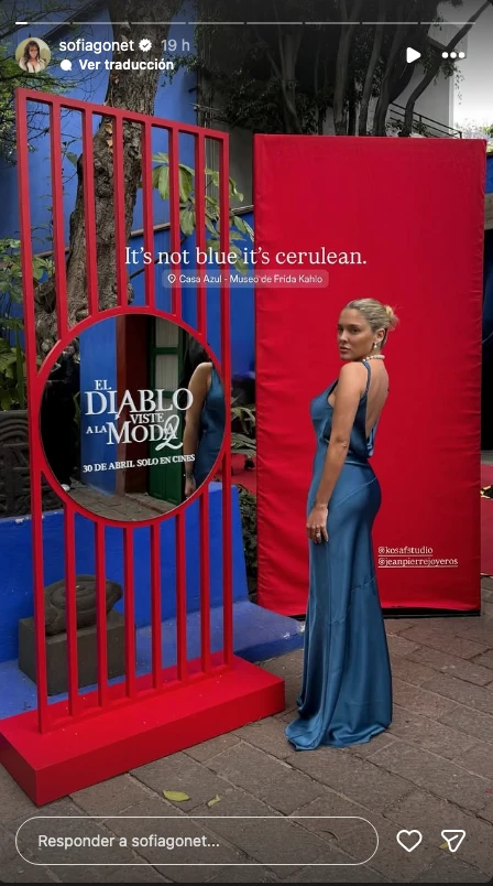 Para asistir a una de las galas que se realizó en la casa Frida Kahlo, Sofía apostó por un vestido largo en tono azul, un color que no pasa desapercibido, y que inevitablemente remite al icónico discurso de El diablo viste a la moda.