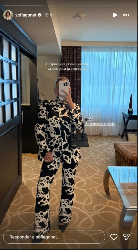 Para la entrevista, Sofía se alejó de lo clásico y fue por un statement look: un conjunto sastrero con estampa de vaca en blanco y negro.