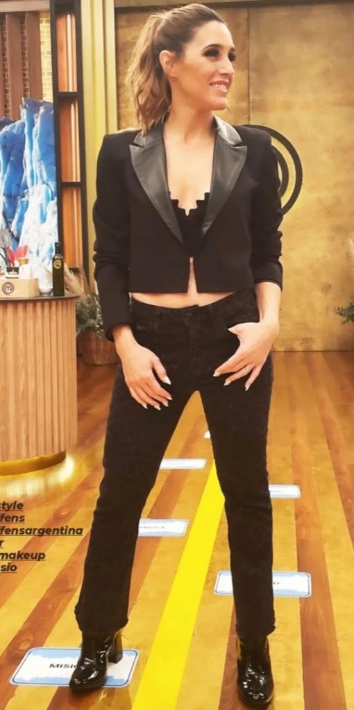 La Sole eligó un blazer con solapa de charol y cuello tipo smoking. Las botas también son de charol y llevó un crop top estilo lencero, que le dió el toque sexy al outfit.