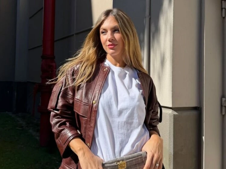 El outfit combinó una remera blanca básica, convertida en ancla minimalista del look, con una mini falda a cuadros de aire colegial (de la firma Miu Miu) que sumó ese toque preppy tan propio de la tendencia. Además, sumó una campera de cuero en color chocolate que dio una vibra vintage y elegante.