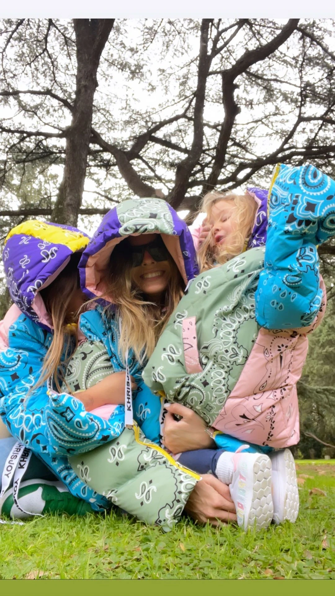 Para combatir las altas temperaturas, las mujeres de la familia se lookearon con la misma campera con estampa patchwork de colores.