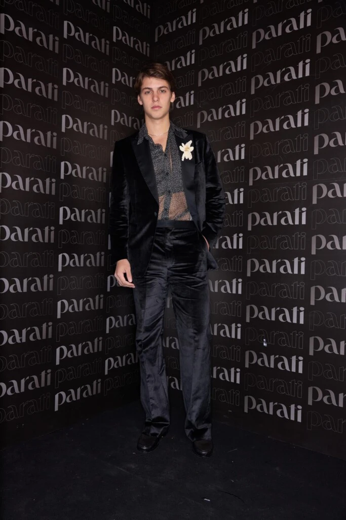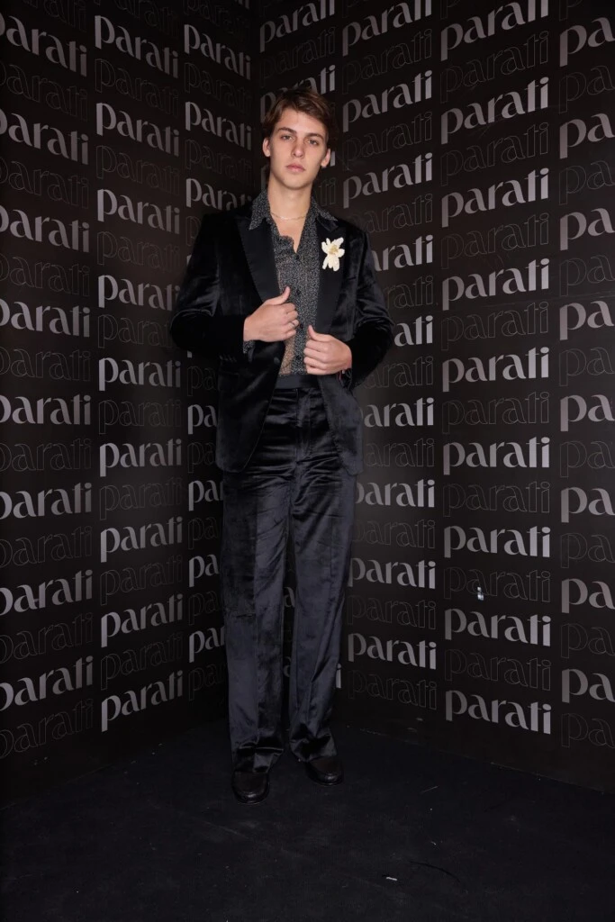 Por su parte, Benicio eligió un traje negro de terciopelo que reinterpreta la sastrería clásica con un giro contemporáneo. Lo combinó con una camisa de tul transparente, aportando frescura y un aire más descontracturado.