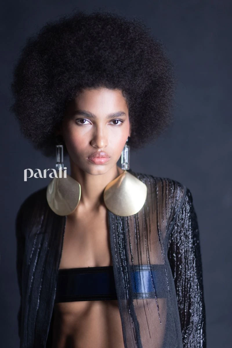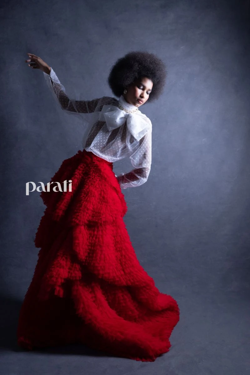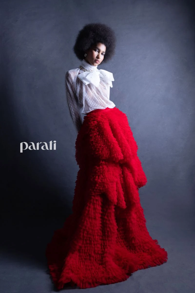 La blusa con cuello alto de plumetí totalmente transparente tiene luz propia e ilumina dejando con un lúdico moño extra large en el frente. La falda es amplia e irregular con miles de volados que parecen tener vida propia al caminar. Los complementos son ligeros y con presencia: caramelos de cristales de colores pastel en el cuello y vistiendo las orejas.