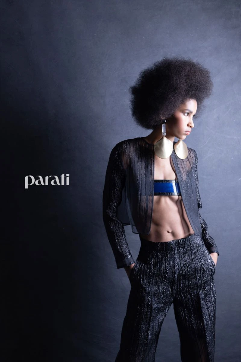 Supo ser un saco que por obra y magia de la moldería se transforma en un híbrido elegante y sexy que todavía conserva las solapas que lo identifican. Desaparece el frente, aparece el escote y ahí ocupa un lugar central el corpiño que se destaca brillante como una luna en una noche cerrada.