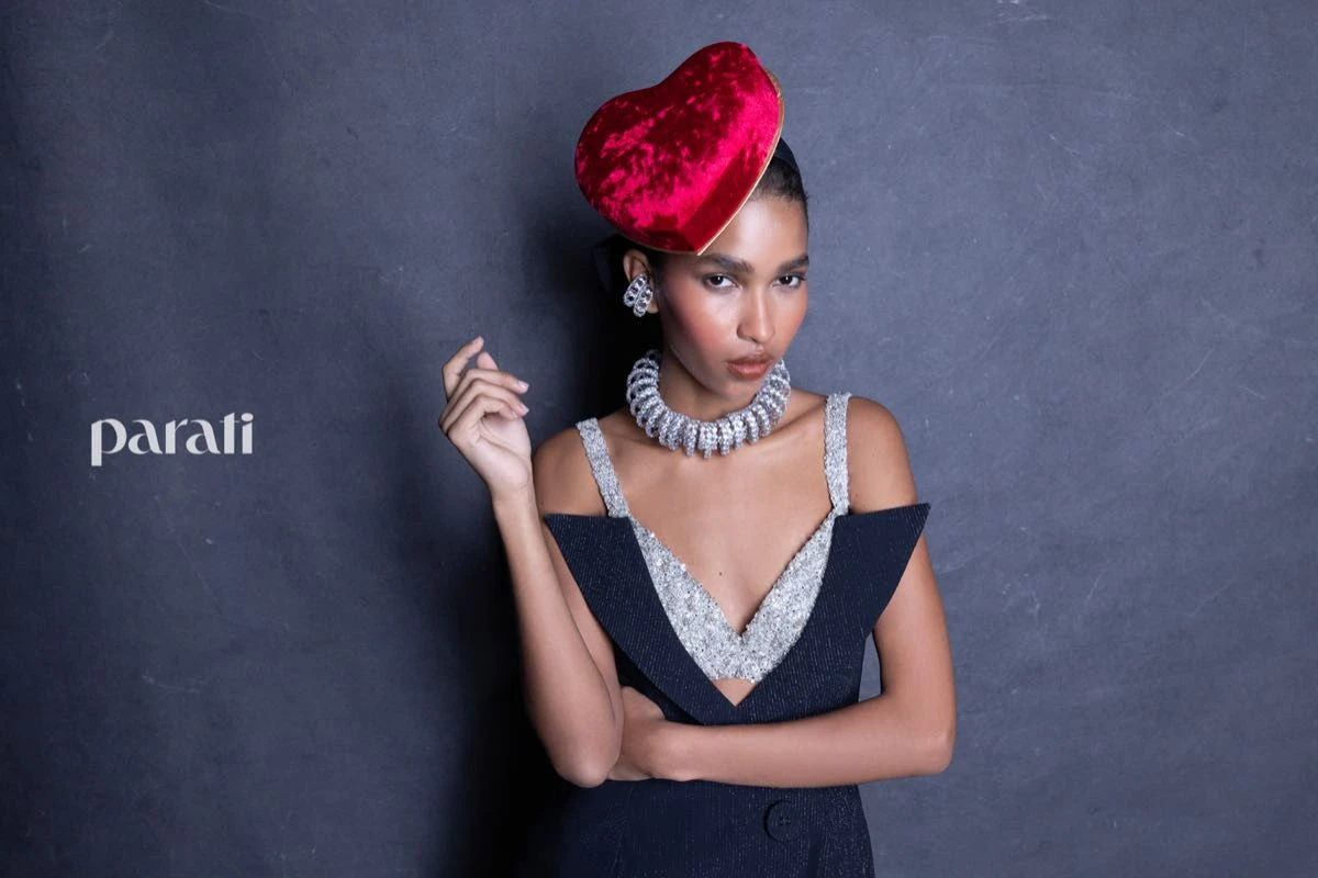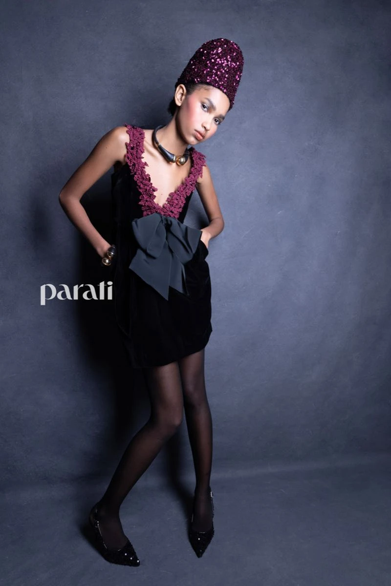 A primera vista llama la atención el escote profundo en un modelo de terciopelo abrigado donde el talle alto rodeado de guipure sumado a un moño presencial que lo destacan. El casquete brilla en una paleta que coordina con el resto del look.