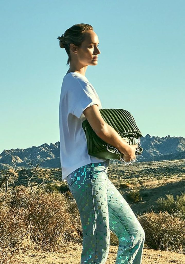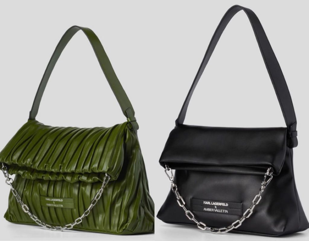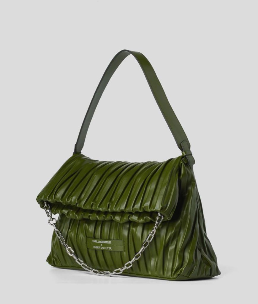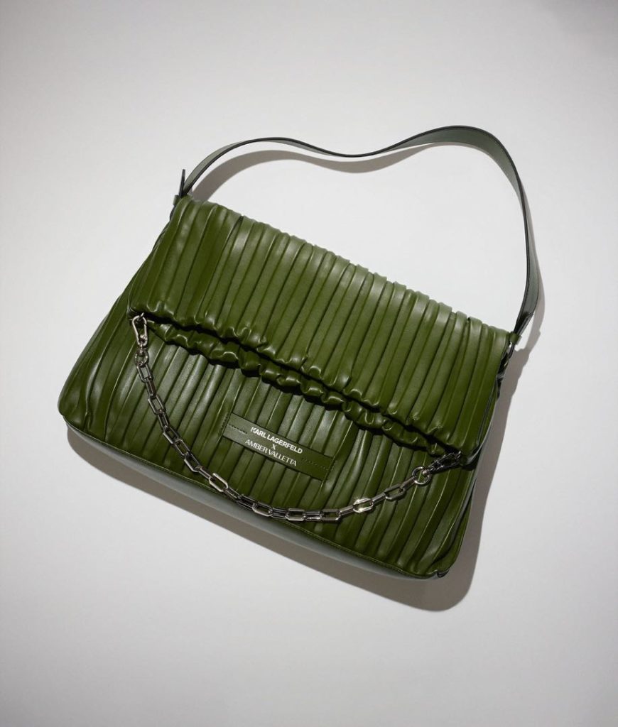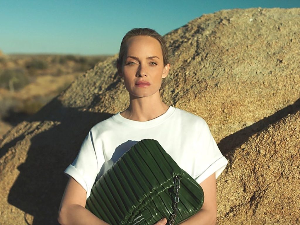 Amber Valletta como parte de una colaboración continua con la marca Karl Lagerfeld, que lanzó una línea de carteras hechas con cuero de cactus. Disponible en verde o negro, la colección tiene una cartera hecha de cuero de cactus vegano desarrollado por la firma mexicana Desserto.