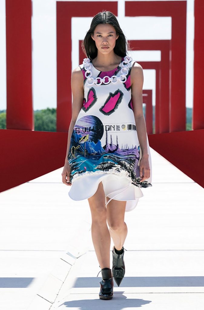Esta colección es tan única como el arte con el que compartió escenario. Volúmenes XXL, trapezoides encerados se codean con faldas de pelota y de neoprene, estampados al estilo japonés adornados con dragones y místicos, paisajes futuristas y juegos de texturas ultra sofisticados.