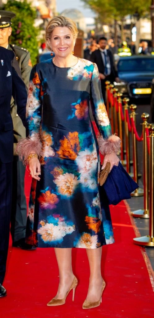 Para esta cita festiva, Máxima brilló con luz propia gracias a un vestido de flores adornado con plumas, un ítem súper chic de esta temporada.