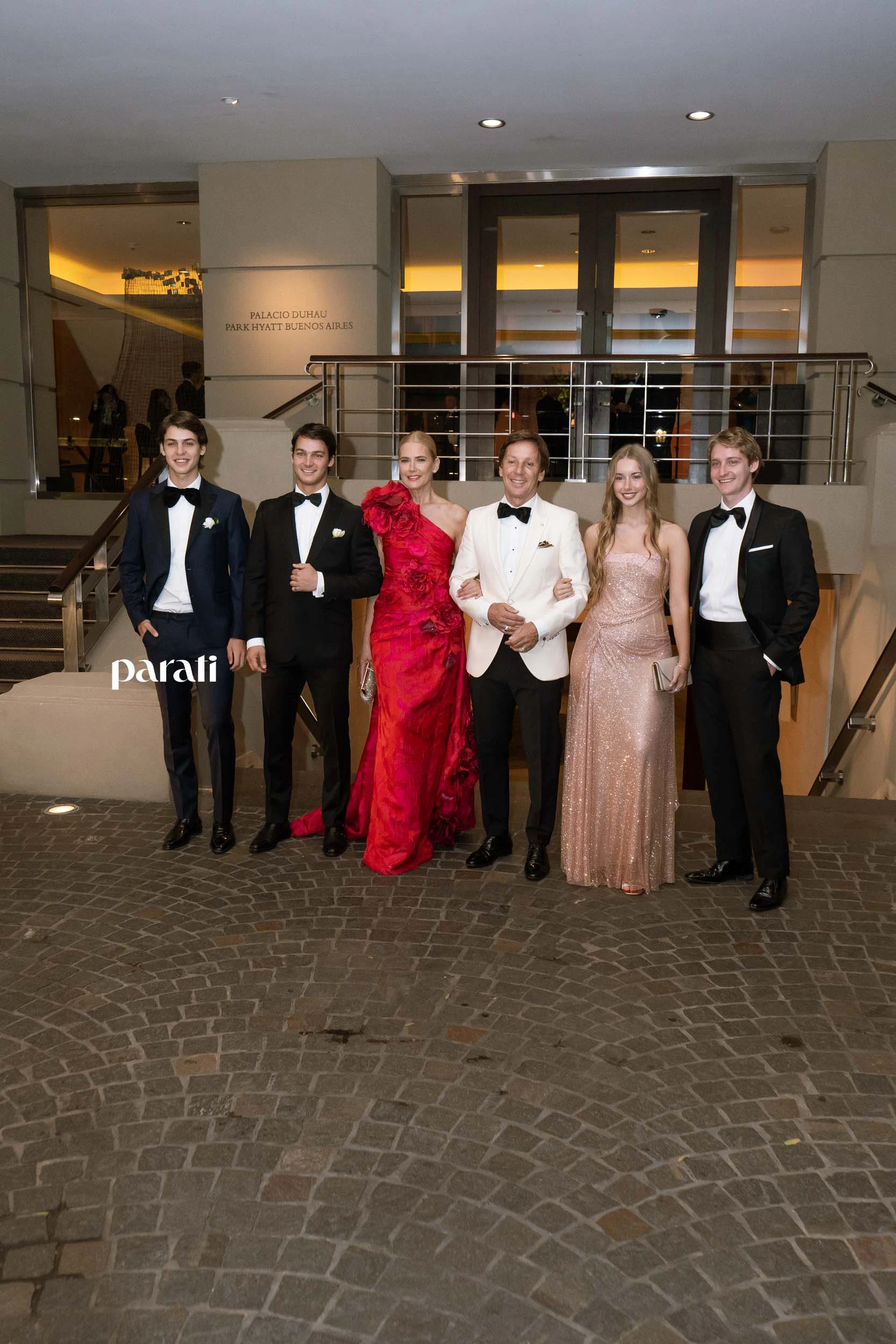 A su lado, Alejandro Gravier optó por la elegancia clásica con smoking de saco blanco, moño negro y pantalón de vestir, mientras que sus hijos se sumaron al dress code de la noche con trajes negros y moños, manteniendo la impronta sofisticada de la familia.