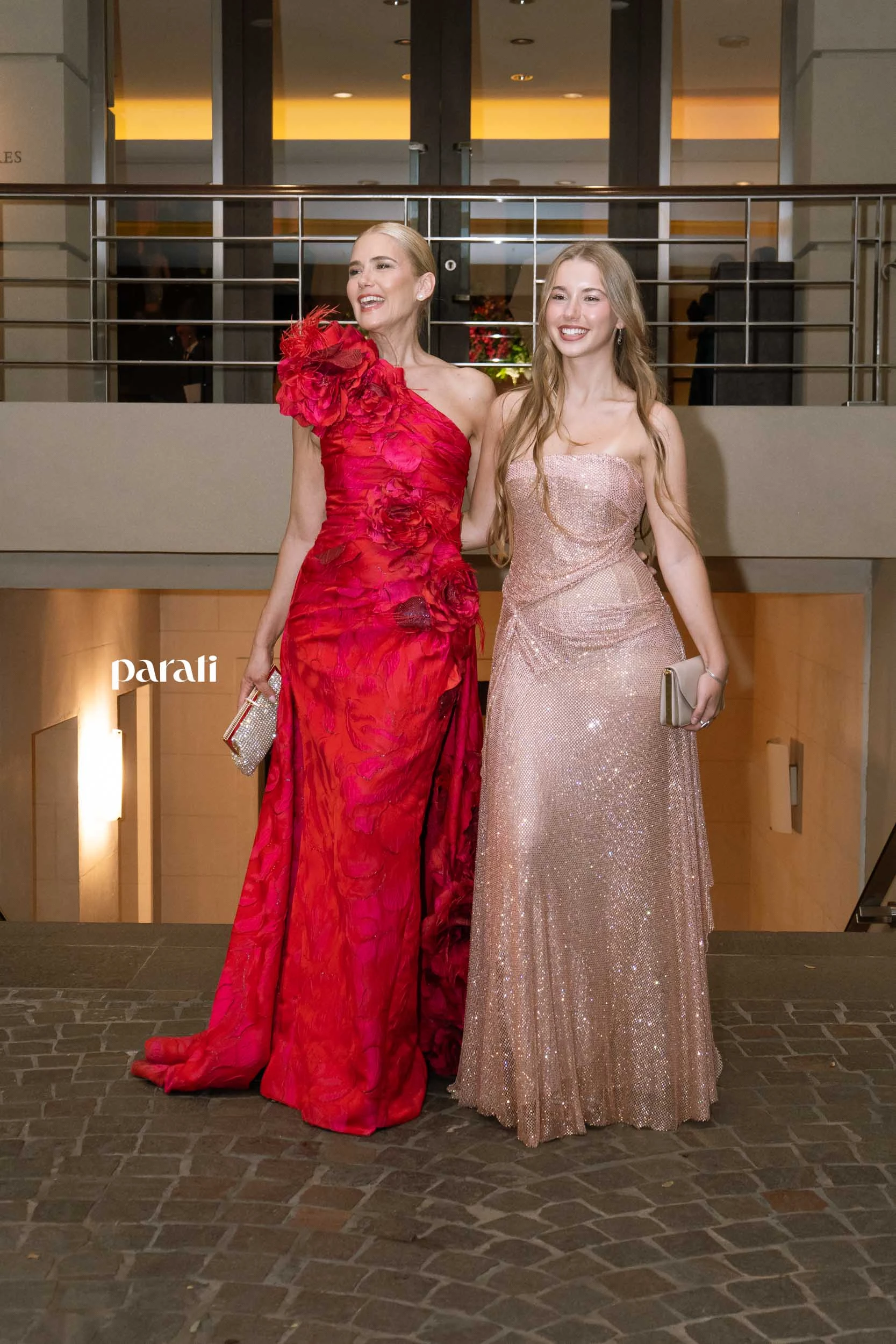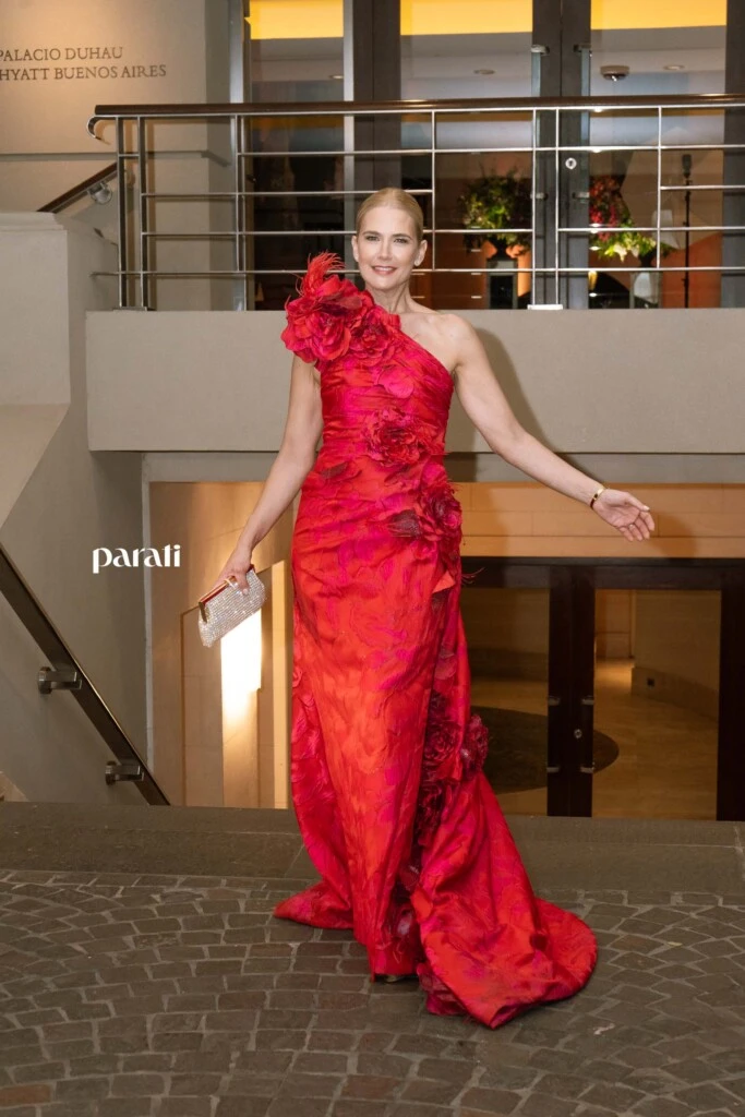 Pero además de la solidaridad, la noche tuvo su cuota de glamour. Valeria Mazza deslumbró con un vestido rojo con textura floral y una gran flor sobre uno de los hombros, una pieza escultural que combinó con un peinado recogido y joyas discretas que dejaron todo el protagonismo a la silueta.